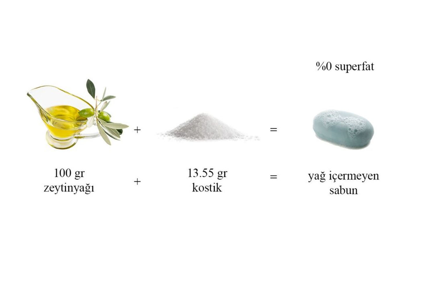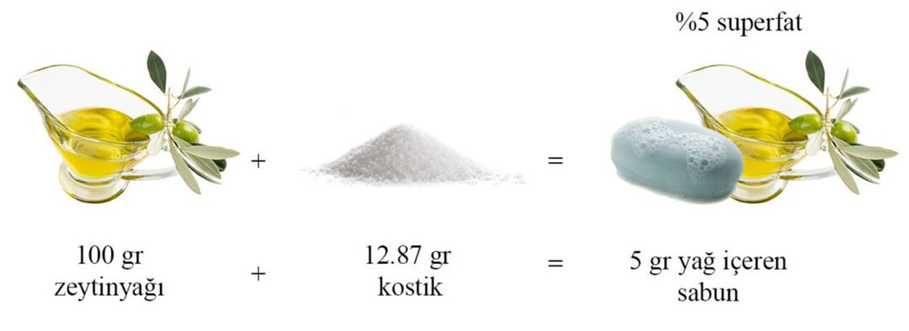 (100 gr zeytinyağı) x (0.1355) = (13.55 gr kostik) şeklinde olacaktır. Yağın tamamı sabunlaştırıldığı için de %0 kostik indirimi yani %0 superfat oranına sahip sabunlar elde edilmiş olunacaktır.