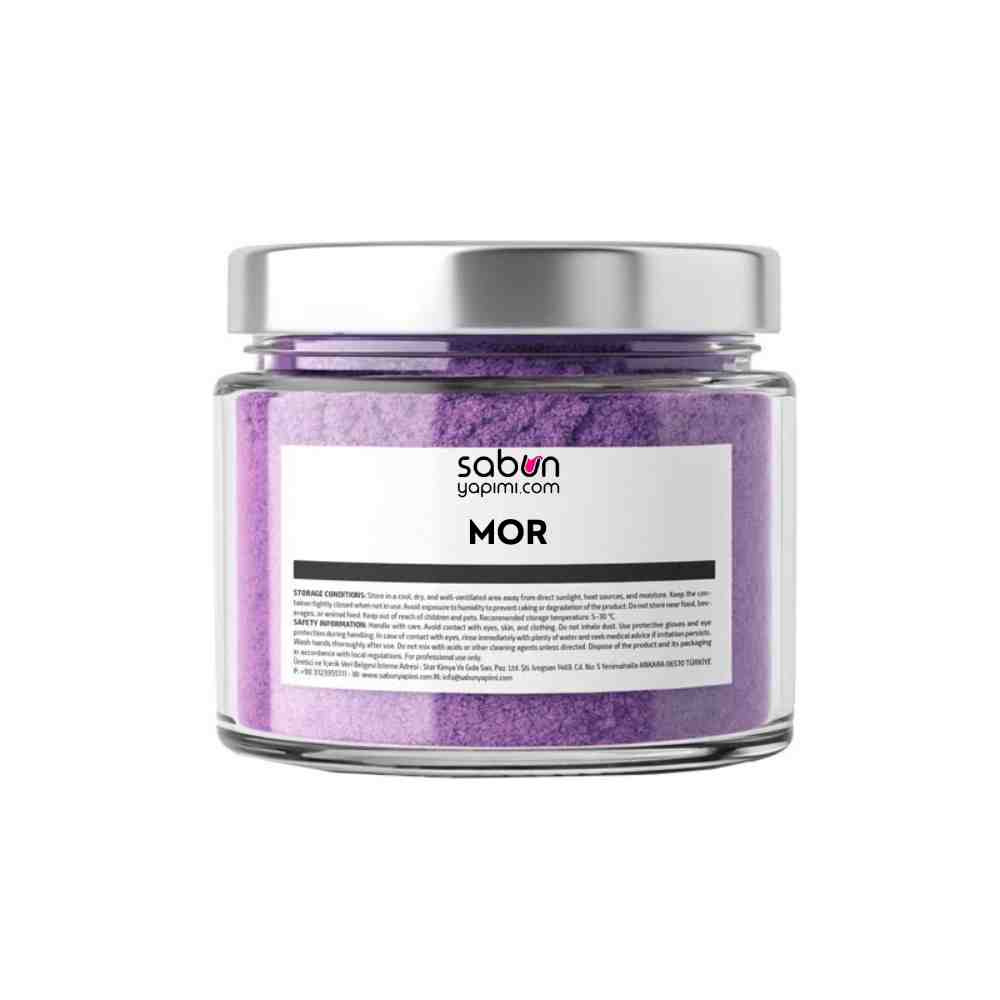 Mor sabun boyası, soğuk ve sıcak işlem sabun üretiminde kullanılabilen, yüksek pigmentasyon gücüne sahip bir renklendiricidir. Ciltle temasa uygun, kozmetik sınıfı içeriğiyle güvenle kullanılabilir. Doğal sabunlarınıza çarpıcı bir mor renk kazandırırken, sabun içeriğiyle mükemmel uyum sağlar ve renk solması yapmaz.